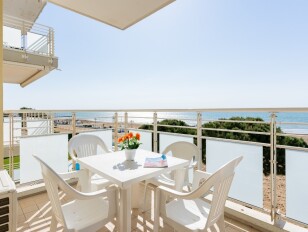 Apartmán má vlastní sociální zařízení, TV, mikrovlnnou troubu, klimatizaci a balkon s přímým výhledem na moře.