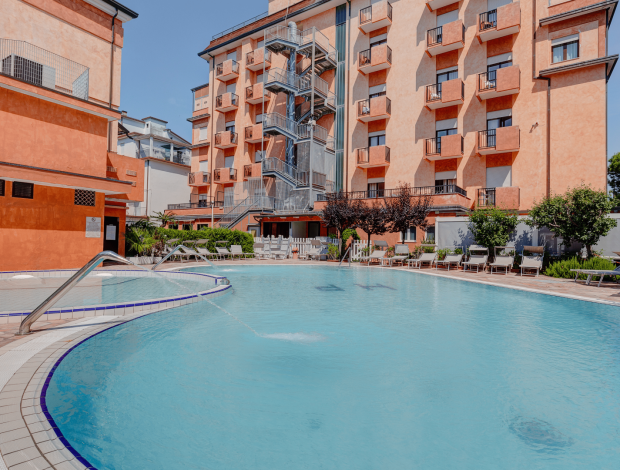 Přímo na hlavní třídě ležící hotel PICCADILLY (Via Bafile) nabízí klientům bazén a dětský bazén s hydromasážní částí, solární terasu s lehátky (omezená kapacita), recepci, výtah, bar s terasou, Wi-Fi, dětský koutek, střešní panoramatickou terasu, půjčovnu kol (elektrokola za poplatek) a parkoviště cca 100 m od hotelu. Pro děti funguje v hlavní sezóně (cca červen - srpen) mini klub. Klienti hotelu mohou také za poplatek využít Wellness centrum Spa a kadeřnictví v blízkém hotelu Nettuno (za poplatek -finská sauna, hydromasážní vana, chromoterapie a aromateapie, Kneipp terapie, relaxační zóna, masáže).