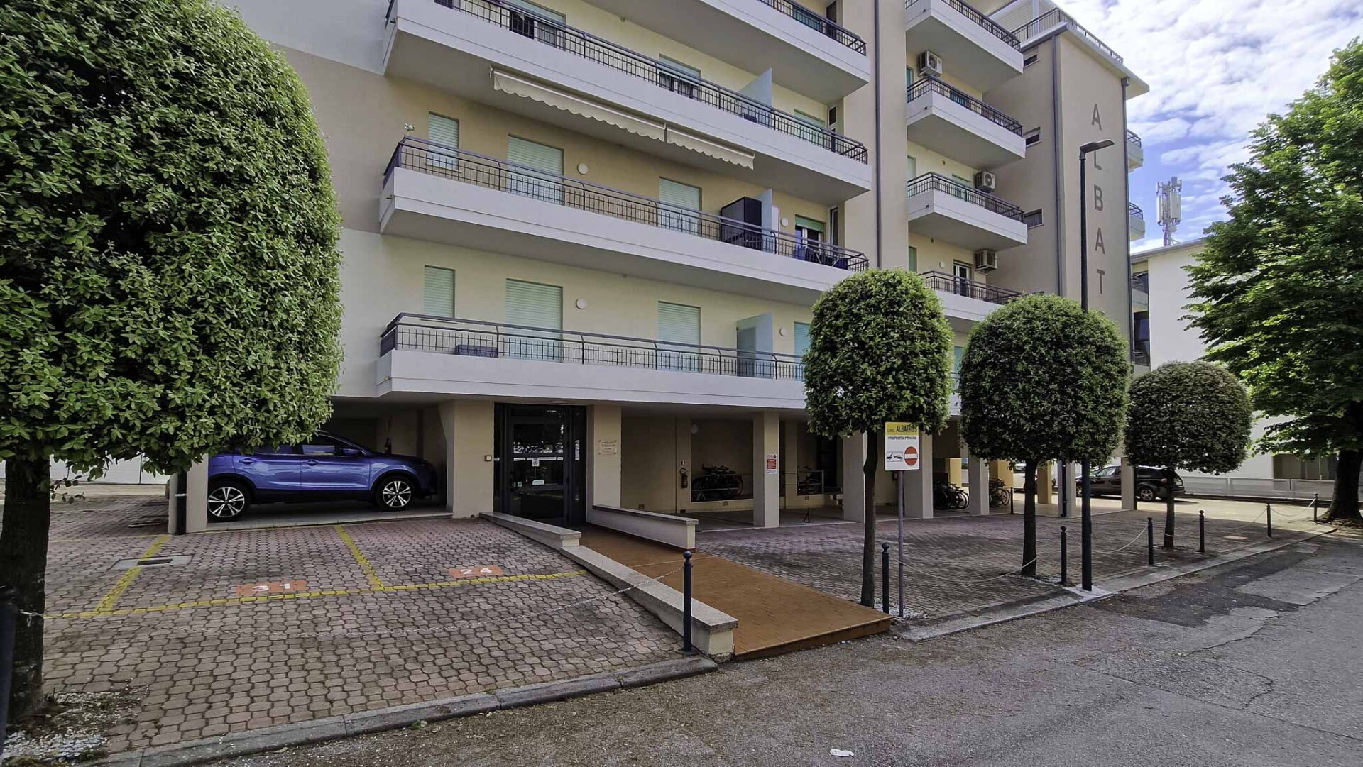 Residence ALBATROS (Via Polluce) se nachází v centru Bibione u jedné z hlavních tříd a zároveň nedaleko pláže. Klientům je k dispozici výtah a parkovací místo pro každý apartmán. Apartmány jsou nedávno zrenovované a mají vlastní sociální zařízení, TV, klimatizaci a balkon. Apartmán typu C má navíc mikrovlnnou troubu.