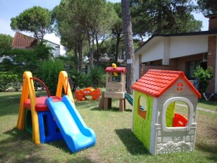 Villaggio GIOVE (Raggio di Giove) se skládá celkem ze čtyř dvouapartmánových bungalowů umístěných v prostorné a udržované zahradě s hračkami pro malé děti. Villaggio se nachází nedaleko parku Parco Hemingway s dětským hřištěm a množstvím různých prolézaček. Klientům je k dispozici společné barbecue a pračka, ke každému apartmánu náleží parkovací místo.