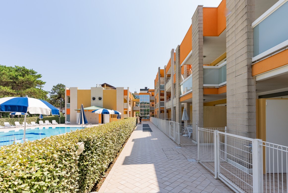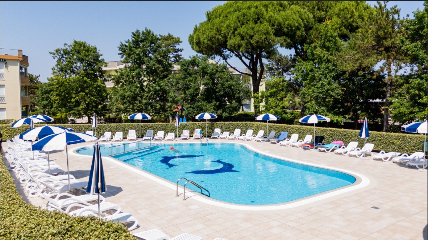 Nedávno postavená residence PARCO DELLE NAZIONI (Viale delle Nazioni) je obklopená piniovým hájem, nabízí krytá parkovací místa, výtah (u schodiště A a C), dětské hřiště, animace (na pláži nebo u baru Sporting) a bazén s dětskou částí. Dobře vybavené prostorné apartmány mají vlastní sociální zařízení, TV/SAT, trezor, kávovar, mikrovlnnou troubu, klimatizaci a prostorný balkon nebo zahrádku v přízemí. Typ C1 trilo 7/9 se nachází v nejvyšším patře, má balkon, ze kterého vede venkovní schodiště na terasu s grilem a k podkrovní místnosti s rozkládacím dvougaučem a druhým sociálním zařízením. V nedalekém baru Sporting je možnost připojení na Wi-Fi.