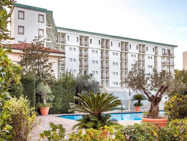 Příjemný HOTEL AURELIA**** (Viale Due Giugno) se nachází nedaleko centra letoviska s obchody a restauracemi a přímo u soukromé pláže, na kterou mají klienti přístup z hotelové zahrady pěšinou vedoucí pod pergolou. Hotel má recepci, výtah, Wi-Fi, bar, restauraci s venkovní terasou, společenskou místnost s TV, čítárnu, úschovnu zavazadel, směnárnu, kongresový sál, bazén s dětskou a hydromasážní částí (v provozu cca pol. dubna - září, možnost vyhřívání a zakrytí mimo hlavní sezónu, dle počasí), solární terasu se slunečníky a lehátky, wellness centrum (za poplatek; masáže, sauna, emocionální sprchy, solárium, čajový relaxační koutek), fitness posilovnu, piano bar (v hlavní sezóně), prostornou zahradu, miniklub pro děti (červenec-srpen), dětské hřiště, tenisový kurt a nordic walking (obojí za poplatek), úschovnu kol, posilovnu a parkoviště (na vyžádání, za poplatek). Možnost půjčení plážové osušky 4 €/ks.